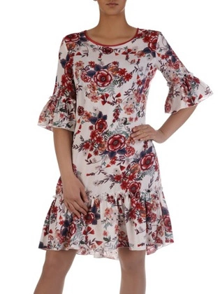 Elegancka sukienka w dziewczęcym fasonie 15672, kreacja w ozdobne kwiatki.