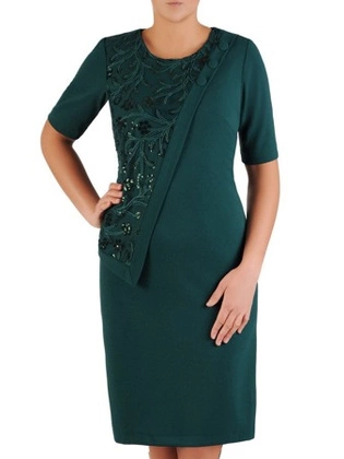 Elegancka sukienka wyszczuplająca, kreacja wyjściowa z ozdobnymi wstawkami 34352