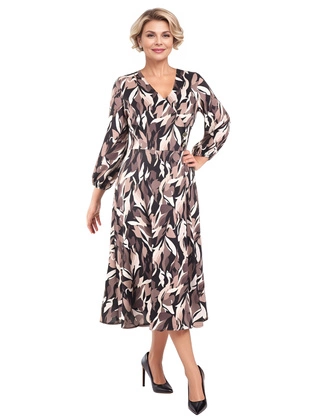 Brązowa sukienka maxi w liście – jesienna sukienka wyszczuplająca z dzianiny 40388