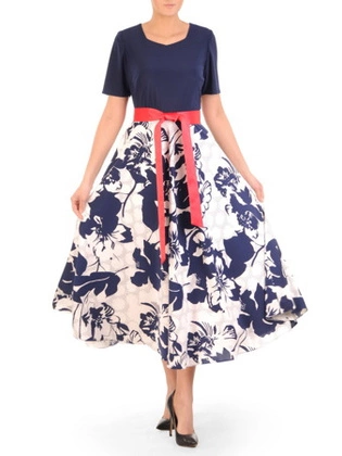 Sukienka damska z wzorzystą spódnicą, kreacja o długości midi 33025