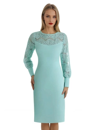 Miętowa sukienka z dekoracyjnym, koronkowym karczkiem 14857.