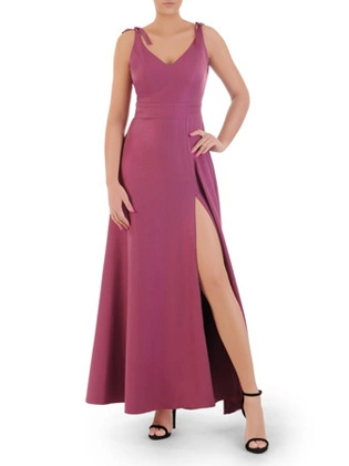 Wrzosowa suknia w nowoczesnym fasonie, kreacja z efektownym rozcięciem 33289