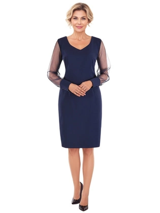 Granatowa sukienka z tiulowymi rękawami 14726, wieczorowa kreacja z ozdobnym dekoltem.