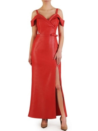 Wieczorowa suknia na cienkich ramiączkach, długa czerwona kreacja 25133
