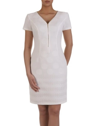 Żakardowa sukienka ze złotym suwakiem 15946, elegancka kreacja w jasnych kolorach