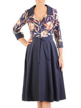 Rozkloszowana sukienka z paskiem, modna kreacja z kołnierzem 34433