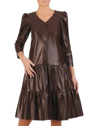 Elegancka brązowa sukienka z ekologicznej skóry z modnymi marszczeniami 27843
