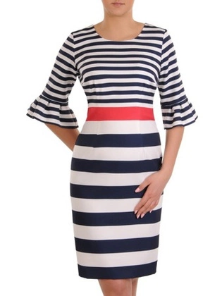 Elegancka sukienka w marynarskie paski, kreacja z ozdobnymi rękawami 19776