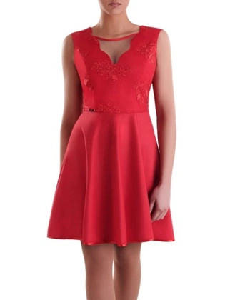 Rozkloszowana sukienka Skarlet VIII, czerwona kreacja z artystycznie wykończonym dekoltem.