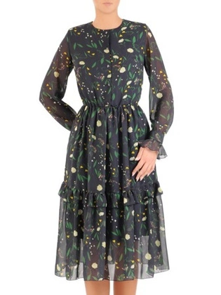 Rozkloszowana sukienka z szyfonu, kreacja z falbanami na rękawach 27475