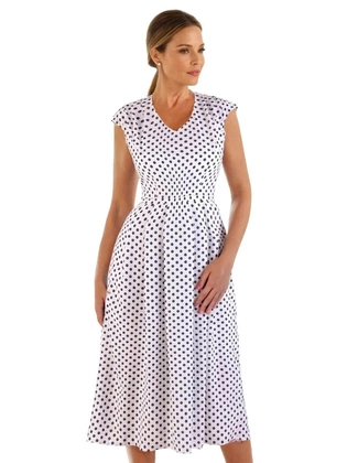 Sukienka damska w groszki, rozkloszowana kreacja w wyszczuplającym fasonie 21276