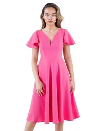 Sukienka na wesele, różowa, rozkloszowana sukienka midi z tiulową wstawką przy dekolcie 38502