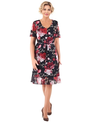 Elegancka sukienka w kwiaty, kreacja maskująca niedoskonałości 32870