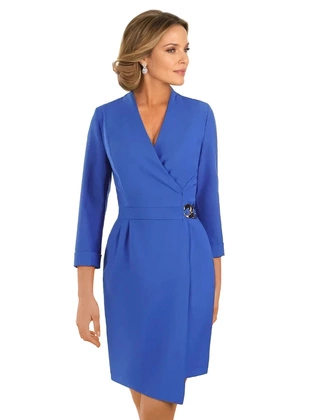 Chabrowa sukienka kopertowa z ozdobną klamrą, kreacja wizytowa 31463