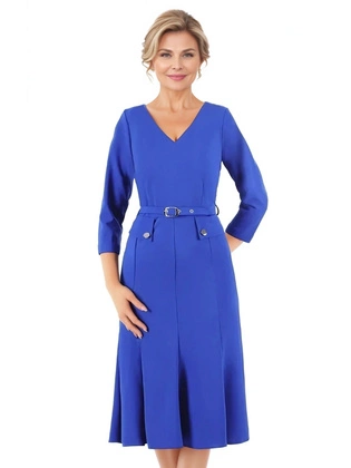 Sukienka damska Alberta III, chabrowa kreacja w fasonie maskującym biodra i uda.