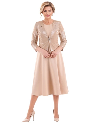 Elegancki komplet damski – beżowa sukienka z żakietem na wesele, komunię i inne uroczystości 39506