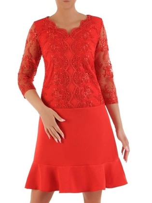 Sukienka z ażurowymi wstawkami 14386, czerwona kreacja z nowoczesnym zdobieniem