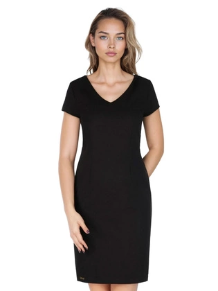 Czarna sukienka z efektownym dekoltem, prosta kreacja wizytowa 18899