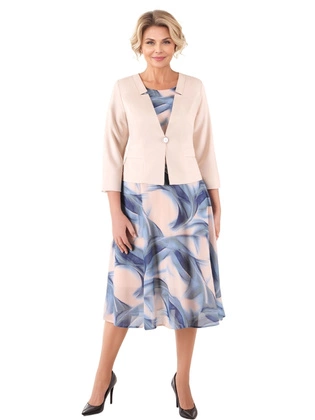 Elegancki komplet damski na wesele i komunię – rozkloszowana sukienka z beżowym żakietem 39846