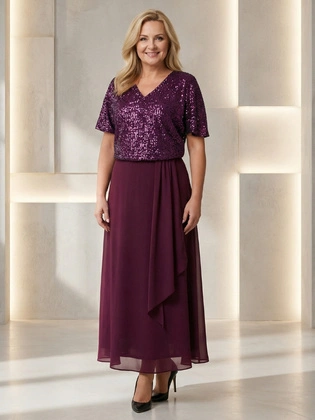 Chabrowa sukienka szyfonowa maxi z paskiem – rozkloszowany fason na wesele i komunię dla kobiet 50+ 39552