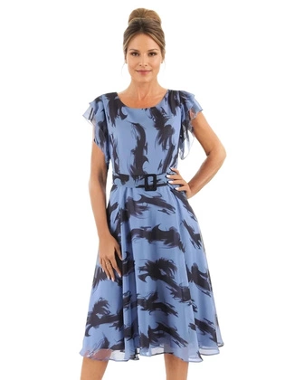 Elegancka, chabrowa sukienka z ozdobnie wyciętymi rękawami 34947