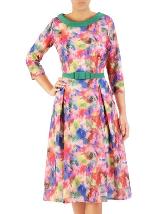 Rozkloszowana sukienka z kołnierzem, kreacja w kolorowy wzór 32974