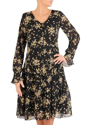 Trapezowa sukienka z szyfonu, kreacja z falbanami na rękawach 27594