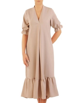 Lniana sukienka midi, luźna kreacja z ozdobną zakładką 30375