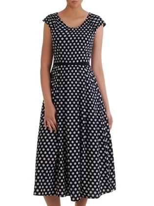 Długa sukienka w groszki 16625, rozkloszowana kreacja z wyszczuplającym paskiem.