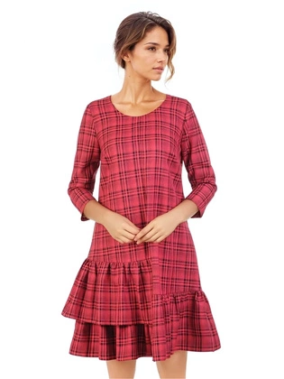 Luźna sukienka z ozdobnymi falbanami, kreacja w modną kratę 30695