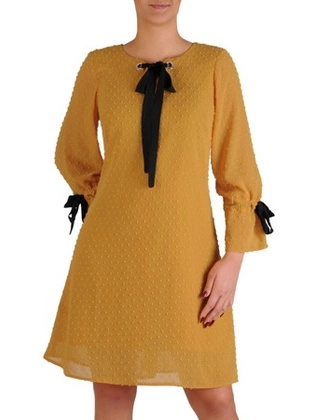 Sukienka damska 18583, musztardowa kreacja z kontrastowymi wstawkami.