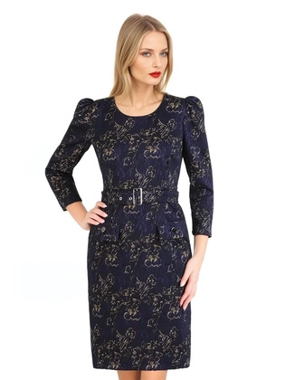 Rozkloszowana sukienka z modnym kołnierzykiem 18117, granatowa kreacja wizytowa.