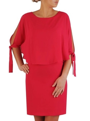 Koralowa sukienka w eleganckim fasonie maskującym niedoskonałości 29248