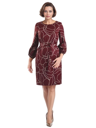 Sukienka damska midi, amarantowa, prosta sukienka koktajlowa z tkaniny, pasek, dekolt V, bufiaste rękawy 38981