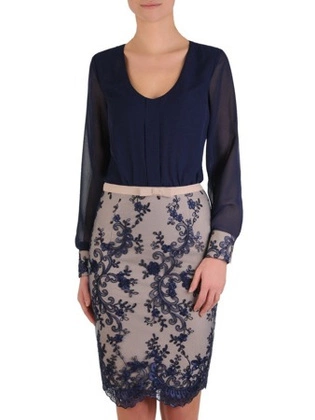 Wieczorowa sukienka z łączonych tkanin, kreacja wykończona koronką 19165