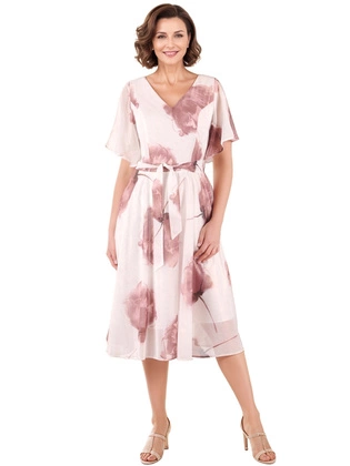 Pudrowa sukienka na wesele, komunię – rozkloszowany fason, kwiatowy wzór, elegancka kreacja z paskiem podkreślającym talię 39644