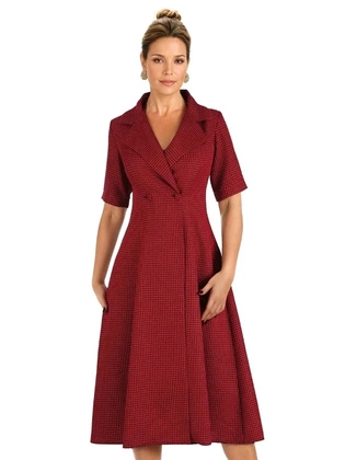 Kopertowa sukienka z modnym kołnierzem 18574, rozkloszowana kreacja w pepitkę.