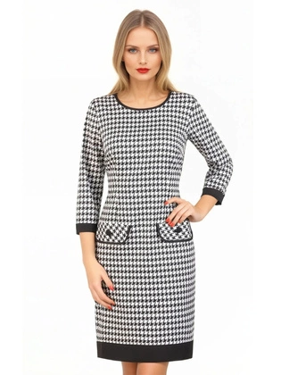 Prosta sukienka na jesień w pepitkę, kreacja z modnymi patkami 31078