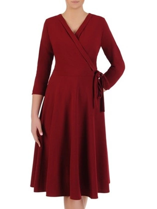Bordowa sukienka kopertowa, rozkloszowana kreacja z ozdobnym wiązaniem w pasie 19754