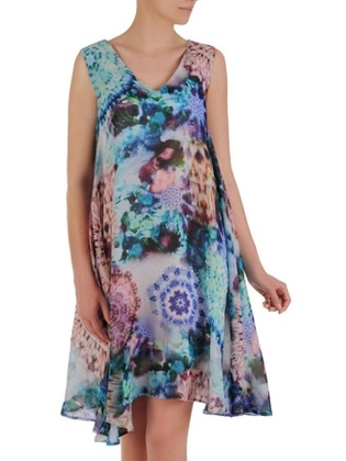 Prosta sukienka w oryginalny wzór, kreacja z modną falbaną 32077