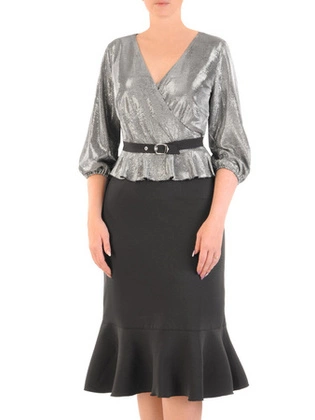 Efektowana sukienka z baskinką, kreacja z połyskującą górą 35005