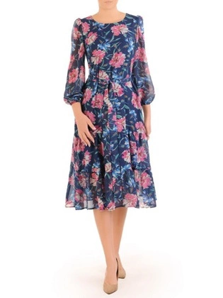 Szyfonowa sukienka w kwiaty, kreacja z bufiastymi rękawami 30483