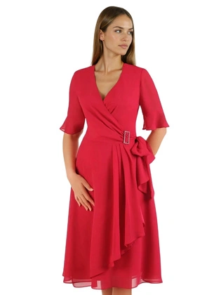 Sukienka koktajlowa, koralowa kreacja z falbanami 25988