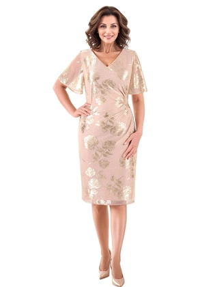 Połyskująca sukienka na wesele midi z dekoltem w serek i ozdobnym marszczeniem 39670