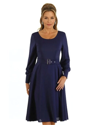 Rozkloszowana sukienka z paskiem, granatowa kreacja z szyfonu 22307