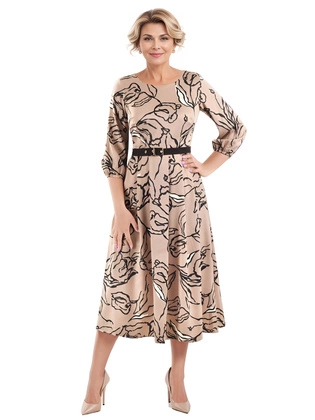 Beżowa sukienka damska maxi w kwiaty – elegancka sukienka rozkloszowana z paskiem i rękawem 3/4 40294