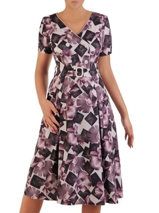 Sukienka wizytowa w kwiaty, elegancka kreacja maskująca niedoskonałości 38031