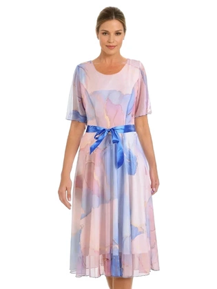 Zwiewna rozkloszowana sukienka na wesele i komunię – elegancka kreacja z paskiem i oryginalnym wzorem 39836