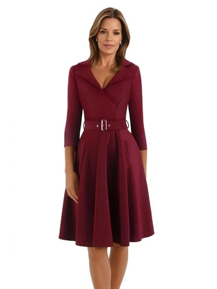 Rozkloszowana sukienka z modnym kołnierzem 14804, elegancka kreacja z paskiem.