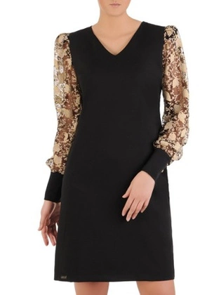 Mała czarna, kreacja z tilowymi, bufiastymi ozdobnymi rękawami 24551